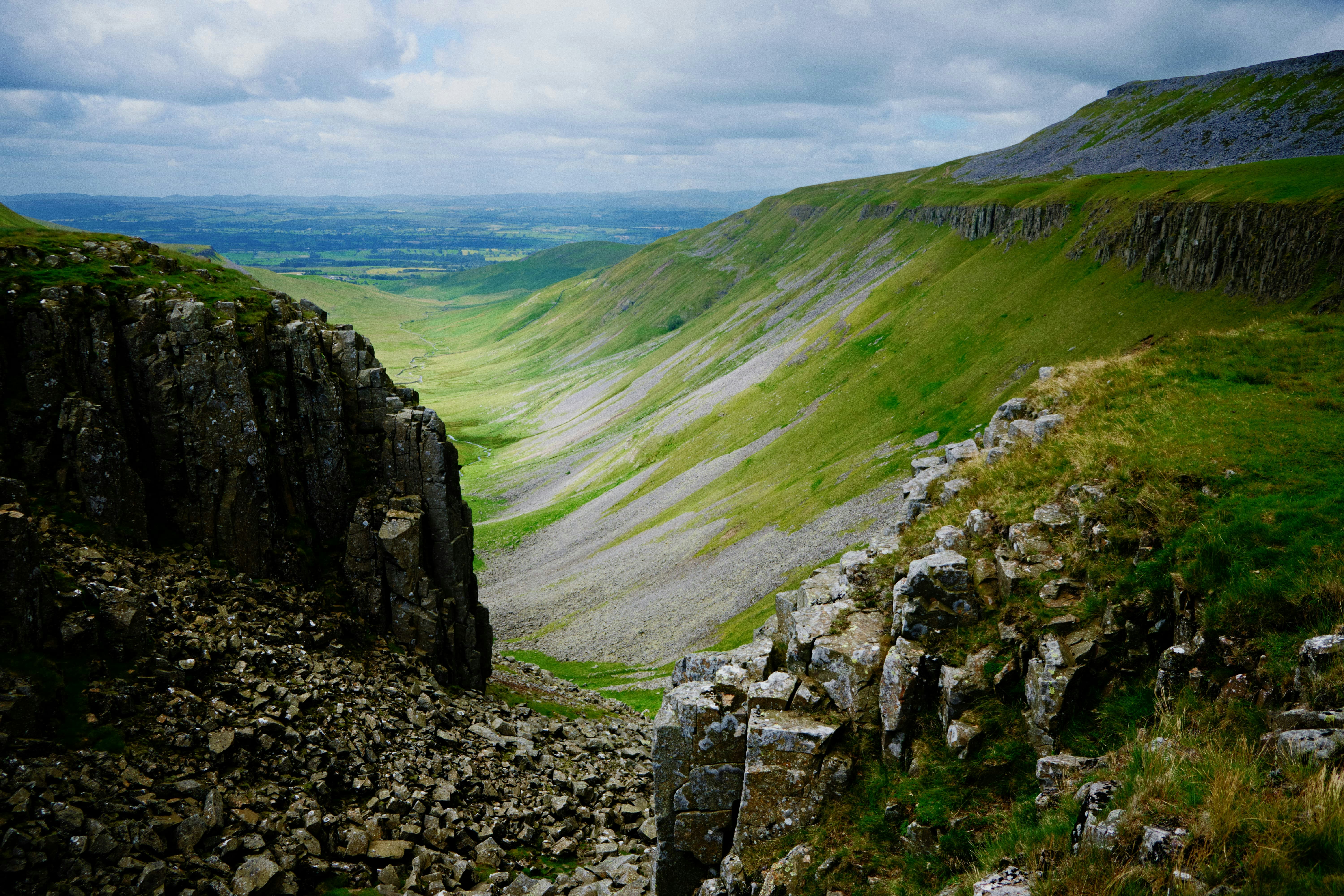 High Cup Nick, or High Cup Gill, is a short but steep U-shaped glaciated valley that cuts deeply into the North Pennine escarpment. Not only is it a spectacular sight for its sheer drops to the valley floor but it also features these columns and pillars of rock near the head of the valley; in places, these cliffs are 70+ ft high.