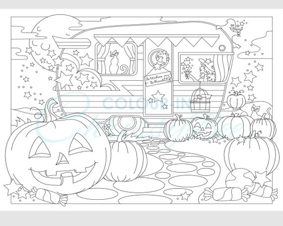 Halloween Coloring Page, Witch coloring page, Spooky, Jack o lantern, Retro Camper Witches on Wheels Colouring page (Digital PDF Printable)